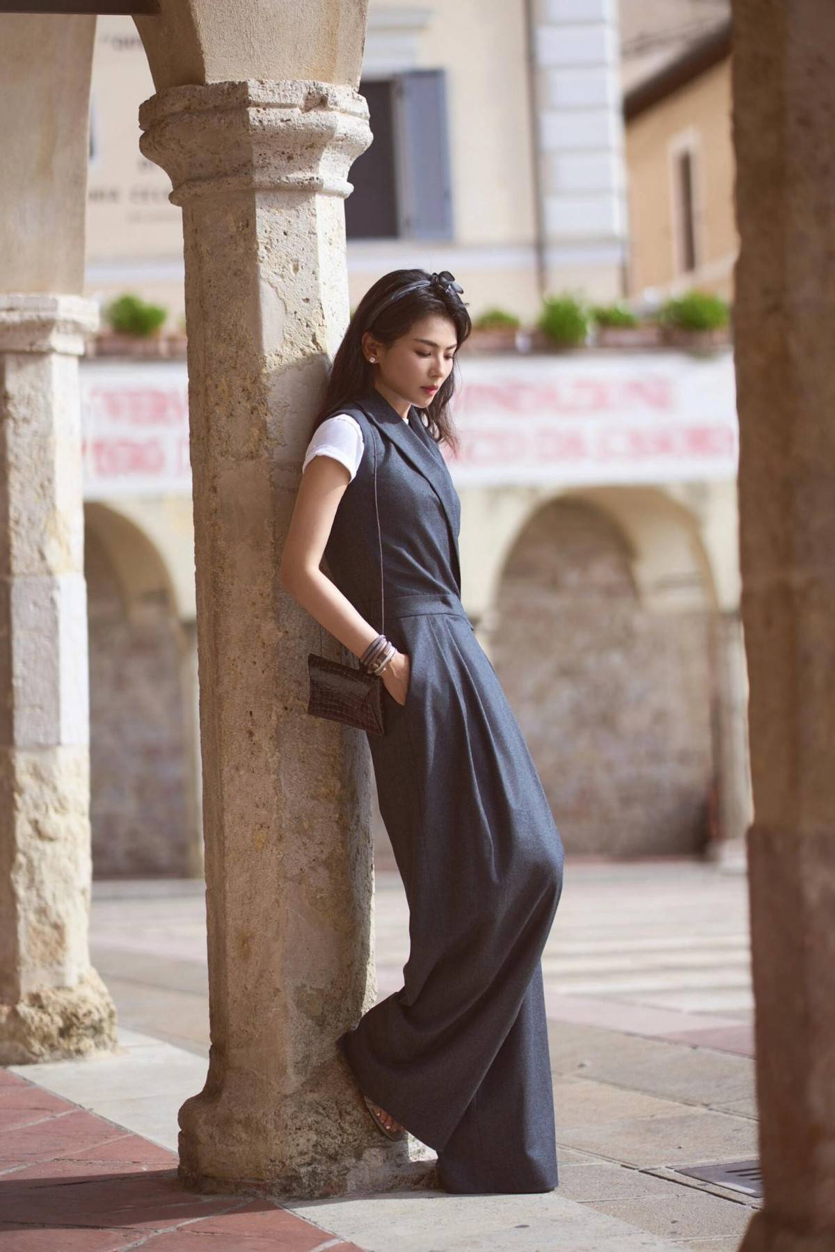 这条灰色无袖连体裤是整个造型的关键所在。深灰色的呢料质感十足,自带高级感与复古韵味,无袖设计露出手臂线条,为整体增添了几分利落。下半身的阔腿裤型是当下流行元素,宽松的裤管在行走间摇曳生姿,既能修饰腿型,又营造出随性不羁的氛围。